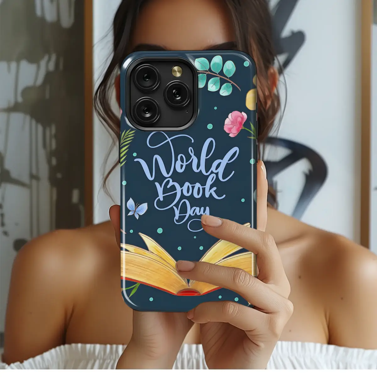 Celebrate World Book Day with this enchanting design! Vibrant watercolor flowers, delicate butterflies, and a captivating open book create a whimsical scene perfect for showcasing your love of literature. This artistic print evokes a sense of wonder and joy, ideal for adding a touch of elegance and literary charm to your everyday essentials. The rich navy background provides a sophisticated backdrop for the colorful floral and book illustrations, ensuring your design stands out. This beautifully crafted artwork is sure to be a conversation starter, making it a unique and thoughtful gift for book lovers or a delightful treat for yourself. High-quality printing ensures the design's vibrancy and detail will last. Embrace the beauty of reading and express your passion with this stunning piece of art, capturing the spirit of World Book Day in every detail. The design's detailed watercolor style and charming elements make it a truly special accessory. Show your love for books with this unique and stylish statement.
