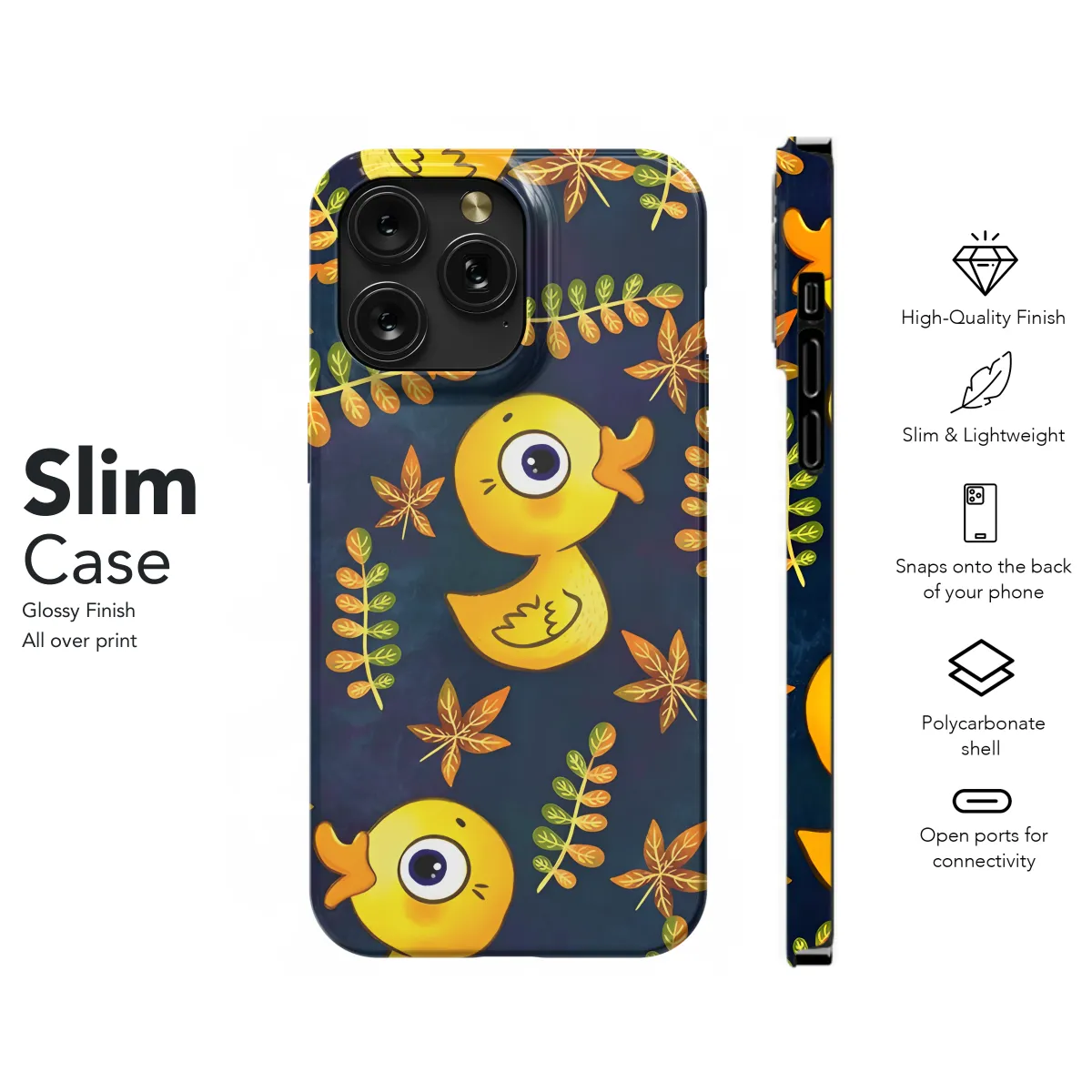 **Lively and Adorable Phone Case** Introducing the whimsical and eye-catching Yellow Duck Phone Case that transforms your device into a playful style statement. **Universal Compatibility:** Crafted to perfectly fit iPhone, Samsung, and Pixel models, this case provides protection for your beloved device. **Vibrant Color:** Its sunny yellow hue brightens your day and adds a touch of fun to your phone. The adorable duck design adds a quirky charm, making it a conversation starter. **Protective Design:** This case safeguards your phone from scratches, bumps, and minor drops, ensuring its pristine condition. **Effortless Access:** Precise cutouts allow for unrestricted access to buttons, ports, and camera, so you can use your phone seamlessly.