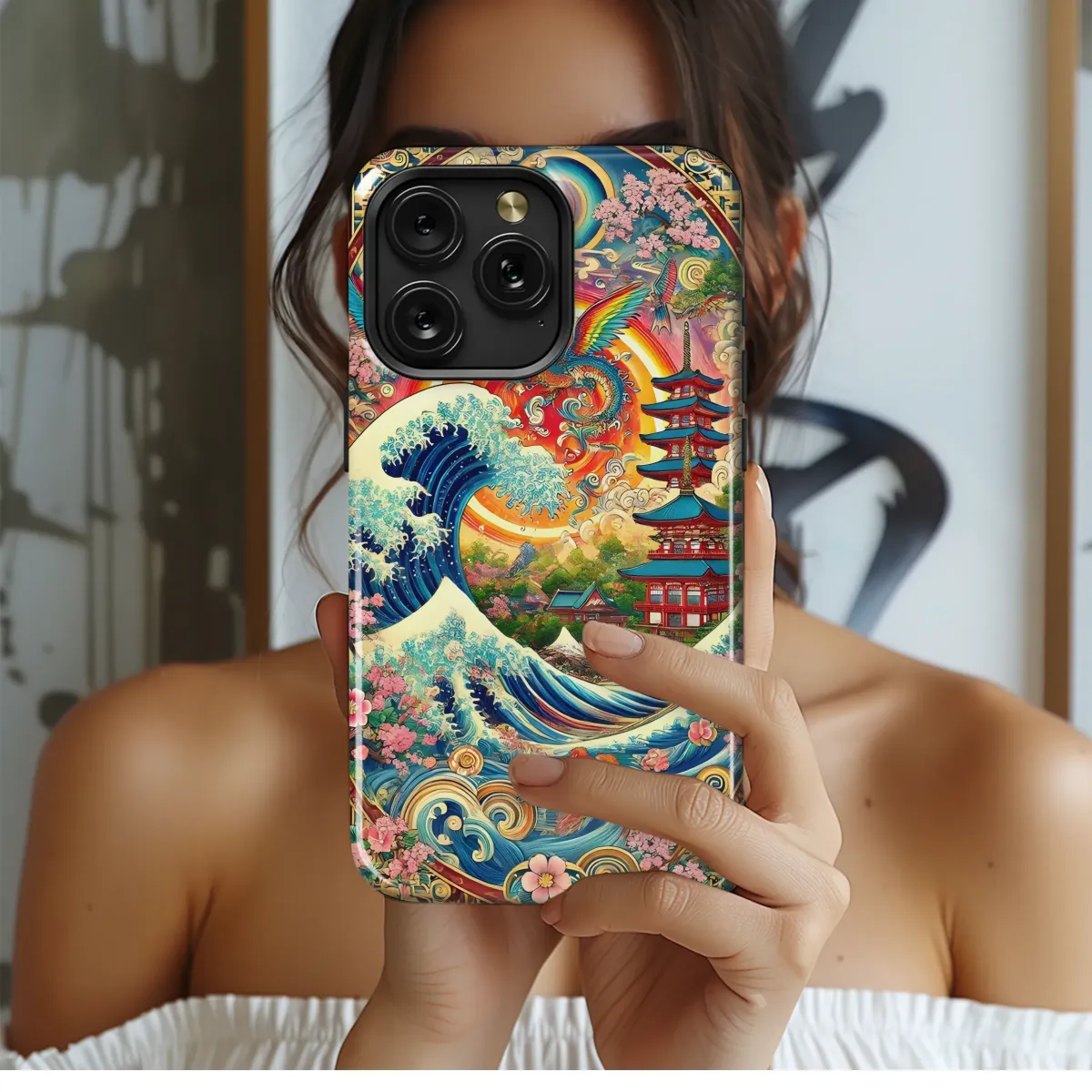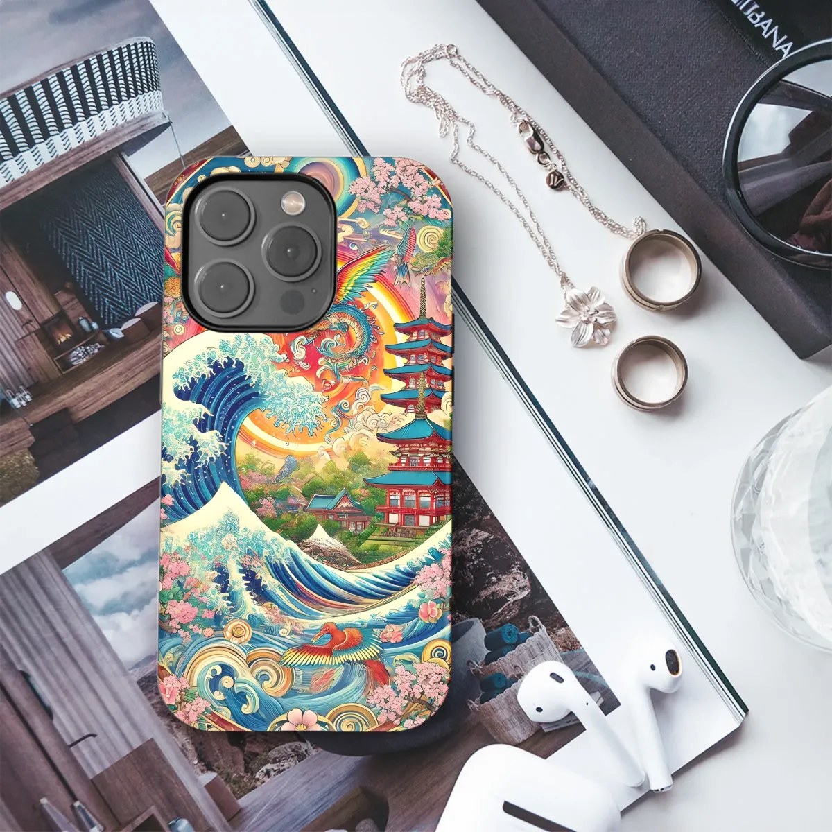 Embrace vibrant artistry with this captivating design, featuring a breathtaking fusion of Japanese wave aesthetics and majestic phoenix birds. The rich, detailed artwork showcases a powerful wave crashing against a serene landscape, adorned with blossoming cherry trees and a striking pagoda. This kaleidoscopic masterpiece blends traditional motifs with a contemporary, psychedelic twist. Perfect for adding a splash of bold, eye-catching color and unique style to your personal accessory, this piece is a stunning example of artistic expression. The intricate detailing and vibrant color palette ensure it stands out from the crowd, reflecting a love for artistic originality and a passion for cultural fusion. This visually stunning design is sure to turn heads and become a conversation starter. Its high-quality print ensures lasting vibrancy and detail, making it a treasured possession. Elevate your everyday style with this exquisitely crafted artwork and let your personality shine through. A perfect gift for art lovers, culture enthusiasts, or anyone who appreciates unique and striking designs.