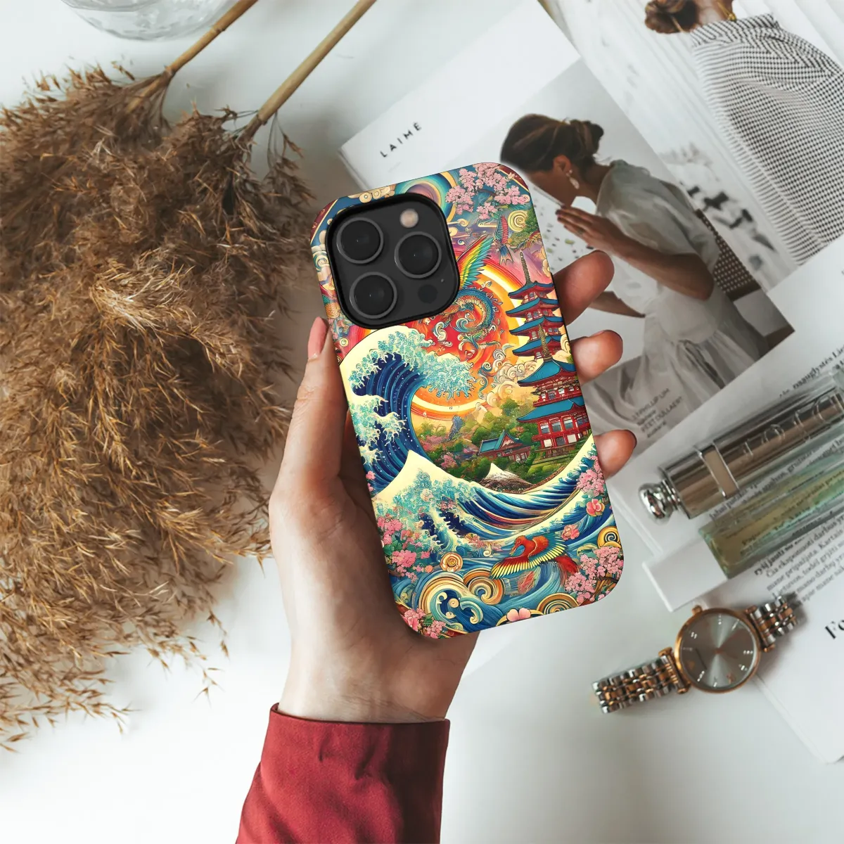 Embrace vibrant artistry with this captivating design, featuring a breathtaking fusion of Japanese wave aesthetics and majestic phoenix birds. The rich, detailed artwork showcases a powerful wave crashing against a serene landscape, adorned with blossoming cherry trees and a striking pagoda. This kaleidoscopic masterpiece blends traditional motifs with a contemporary, psychedelic twist. Perfect for adding a splash of bold, eye-catching color and unique style to your personal accessory, this piece is a stunning example of artistic expression. The intricate detailing and vibrant color palette ensure it stands out from the crowd, reflecting a love for artistic originality and a passion for cultural fusion. This visually stunning design is sure to turn heads and become a conversation starter. Its high-quality print ensures lasting vibrancy and detail, making it a treasured possession. Elevate your everyday style with this exquisitely crafted artwork and let your personality shine through. A perfect gift for art lovers, culture enthusiasts, or anyone who appreciates unique and striking designs.