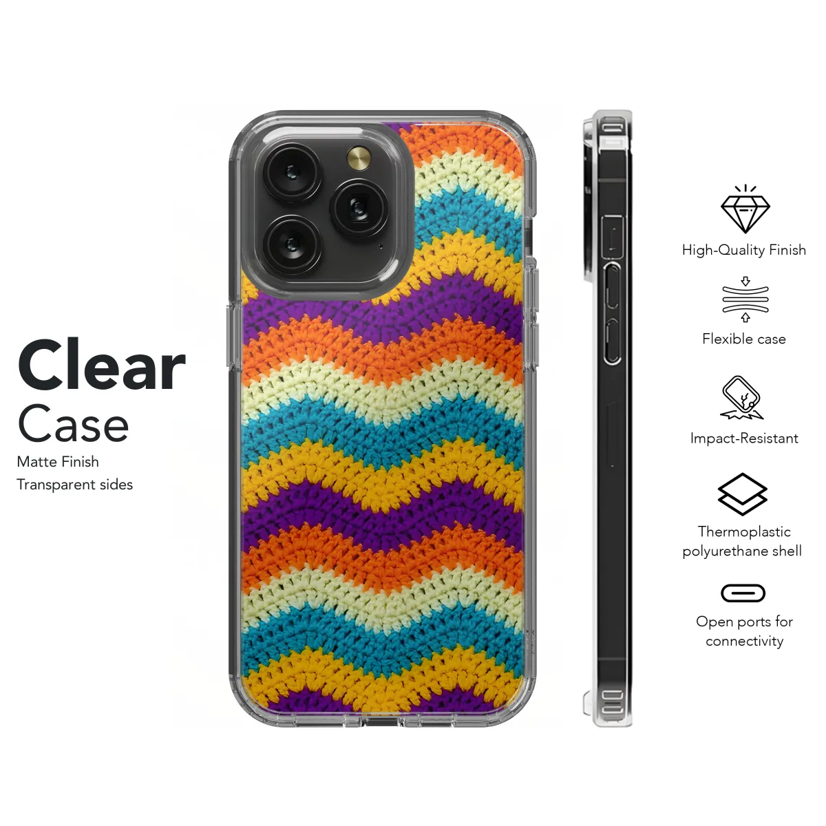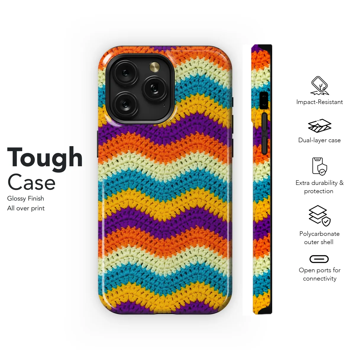 Accessorize your phone with this uniquely designed crochet phone case. Its zigzag pattern adds a touch of elegance and style, while providing protection for your device. Available in a variety of colors, this case is compatible with iPhone, Samsung, and Pixel 3/5/0.